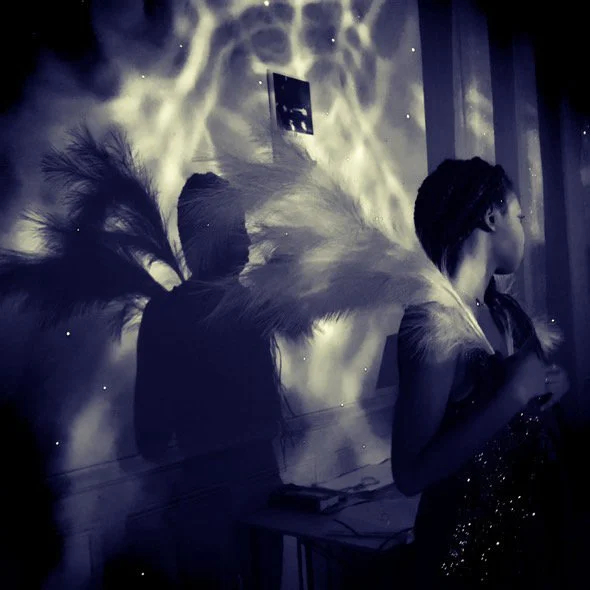 Each snapshot tells a story: intertwined leaves, resembling a labyrinth, symbolize inner confinement, while blurred movements embody instability and the search for balance. The white feathers, both delicate and imposing, evoke a quest for freedom in a world full of tension. The metallic gleam and deep shadows suggest the duality between outward appearances and hidden struggles.